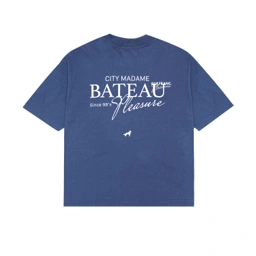 Crafted from premium heavyweight 260gsm cotton. Featuring a bold type  "Bateau Pleasure" screen-printed design.